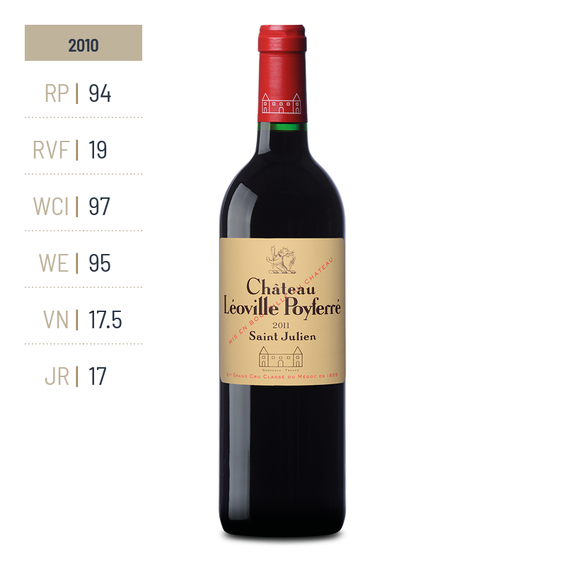 Safra: 2008 – 2009 – 2010: A primeira trilogia fabulosa do século 21. Safra solar, as condições climáticas de 2010 lembram muito as de 2009, embora com temperaturas mais baixas. O próprio vinho evoca tanto o classicismo de 2008 quanto o estilo mais poderoso de 2005. A cor da safra 2010 de Léoville Poyferré é uma cor granada profunda, os reflexos oferecem nuances entre o vermelho e o rubi, sinal de um vinho em bela evolução. O nariz é rico e complexo. Caracteriza-se por notas de frutos pretos intensos, ameixa e groselha preta, mas também especiarias e cedro. Na boca, a safra 2010 é imponente. Os seus taninos são marcados mas permanecem muito finos. Notas de ameixa, especiarias e cedro unem-se num final persistente. Um toque de alcaçuz refresca o poder desta safra e proporciona um equilíbrio ideal para este grande Saint-Julien de requintada precisão. Wine Advocate-Parker: Deep garnet in color, the 2010 Léoville Poyferré opens with notes of sautéed herbs and pencil shavings on the nose, giving way to scents of redcurrant jelly, baked plums and cedar chest plus a waft of cassis. Medium to full-bodied, the palate has pleasant energy and well-played, lightly chewy tannins with compelling freshness on the finish. La Revue du Vin de France: Un monument, un vin concentré, mais précis, avec un volume de bouche superbe, de la complexité et une grande pureté de fruit. Une référence pour le château.